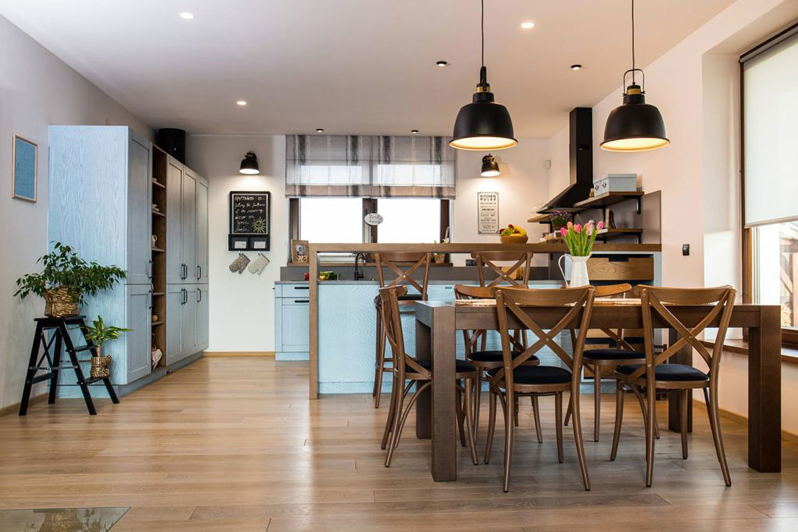 Ukázka realizace interiéru domu laděného do přírodního stylu a světlých odstínů. Jeho doménou je rustikální kuchyň AVIGNON v nevšedním světle modrém odstínu.